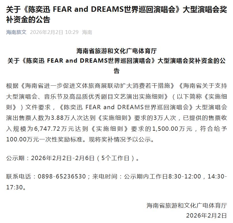 据公告,根据海南相关文件要求,《陈奕迅 FEAR and DREAMS世界巡回演唱会》大型演唱会演出售票人数为3.88万人次达到《实施细则》要求的3万人次,已提供的售票收入规模为6,747.72万元达到《实施细则》要求的1,500.00万元,符合给予100.00万元一次性奖励标准。现将奖补情况予以公示。