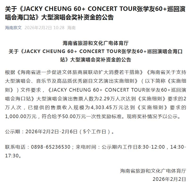 据公告,根据海南相关文件要求,《JACKY CHEUNG 60+ CONCERT TOUR张学友60+巡回演唱会海口站》大型演唱会演出售票人数为2.29万人次达到《实施细则》要求的2万人次,已提供的售票收入规模为4,303.45万元达到《实施细则》要求的1,000.00万元,符合给予50.00万元一次性奖励标准。现将奖补情况予以公示。