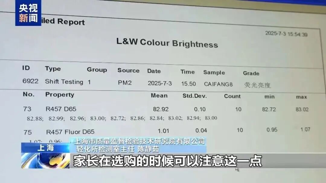 上海市质量监督检验技术研究院有限公司轻化所高级工程师 肖建芳:经过测试,这个本子的荧光亮度是16.02%,远远高出了国家标准5.0%的限量值要求。