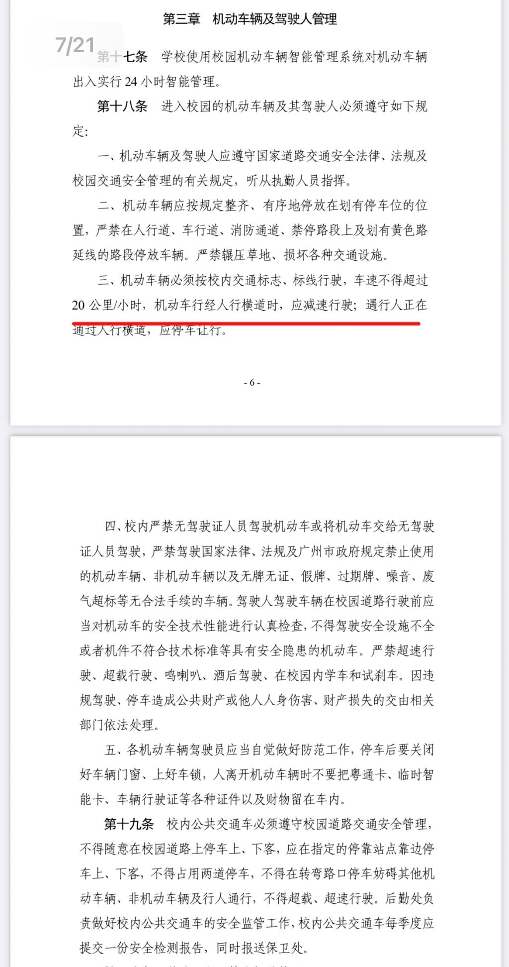 针对校园车辆限速及安全行驶问题,澎湃新闻以学生名义致电华南理工大学保卫处交通科,工作人员表示,校园内的主路、辅路一般都有限速标识,车主和行人都是可以看到的。至于具体最高限速多少、若违规如何处罚等问题,都有明确规定的。